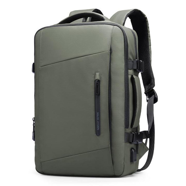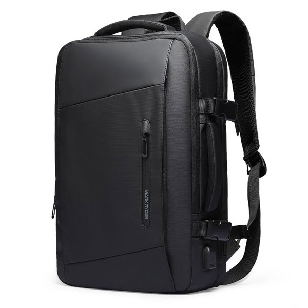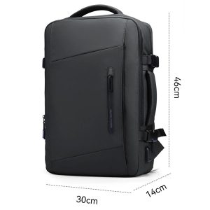 Framan á töskunni er stór renndur vasi og annar minni. Innra rými bakpokans er þvískipt. Fyrst kemur rúmgótt rými með þremur vösum, USB-A snúra sem tengt er við hleðslubanka sem geymdur er ofan í töskunni ásamt festingu fyrir lykla. Aftast við bak er stórt rými með einu stórum vasa, rými fyrir t.d. bækur og sér vasa fyrir allt að 15,6″ – 17,3″ fartölvur. Við bak er renndur vasi. Það er hægt að hafa bakpokann á bakinu eða halda á honum á hlið eins og helgartösku.